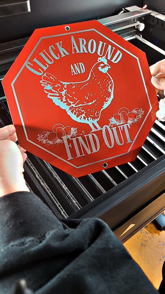 CLUCK AROUND AND FIND OUT YARD SIGN LASER ENGRAVED
