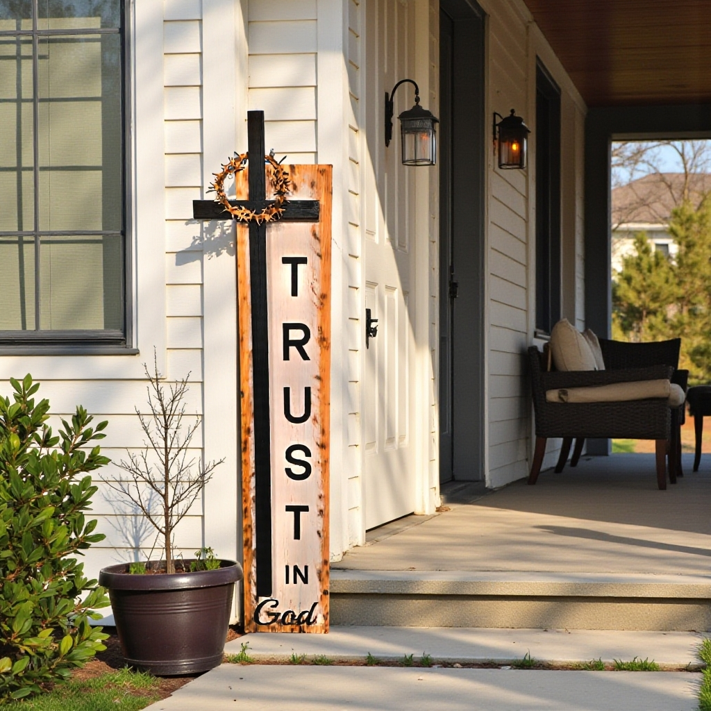 Celebrate the true meaning of Easter with this Trust in God porch leaner, featuring a beautifully crafted wooden cros with a crown of thorns. This Christian sign is the perfect way to welcome guests and showcase your faith during any season .